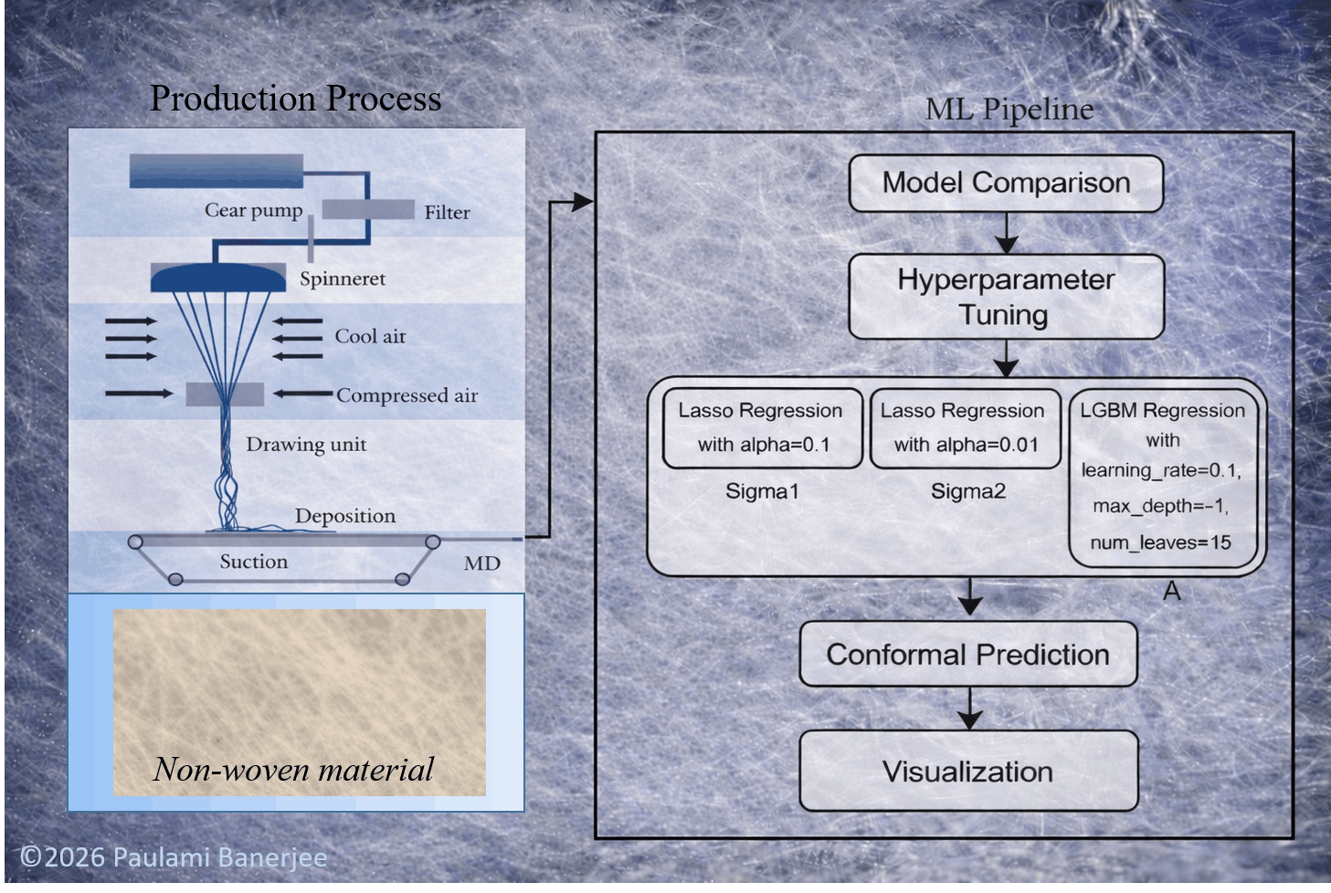 Another project focuses on optimizing the production of nonwoven materials used in medical masks, automotive filters, and hygiene products. The researcher combines domain-specific expertise with informed machine learning, digital twins, and both simulated and real production data to model each stage of the manufacturing process in detail. The resulting insights enable manufacturers to improve product quality, reduce waste, and meet growing industry demand efficiently.